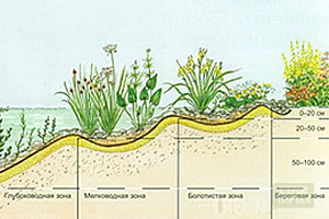 Осуществлять подбор растительности для декоративного пруда необходимо с учетом зон. Базовой составляющей при зонировании является параметр глубины бассейна. Таким образом, пруд делится на следующие части:
